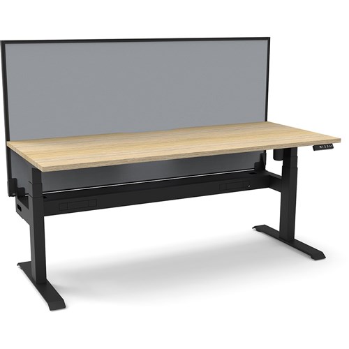 Natural Oak top with Black frame. Unit Dimension: 1800mm W x 750mm D x 1330mm H. 620-1270mm height range for desk. E0 rated top. Powdercoat base. Digital control panel with 3 pre-set positions, LED display panel, keypad safety lock & reminder alarm setting. Anti-collision technology, noise emission of less than 50DB. Lifting capacity of 80kg with a max speed of 25mm per second. 700mm wide foot size with adjustable leveling feet. Comes with 30mm thick privacy screens and cable tray for cable management. 10 Year Manufacturer's Warranty. Delivery, installation and assembly charges may apply to furniture. Please enquire to confirm.