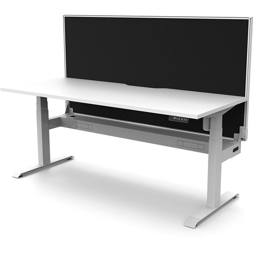 White top with White frame. Unit Dimension: 1800mm W x 750mm D x 1330mm H. 620-1270mm height range for desk. E0 rated top. Powdercoat base. Digital control panel with 3 pre-set positions, LED display panel, keypad safety lock & reminder alarm setting. Anti-collision technology, noise emission of less than 50DB. Lifting capacity of 80kg with a max speed of 25mm per second. 700mm wide foot size with adjustable leveling feet. Comes with 30mm thick privacy screens and cable tray for cable management. 10 Year Manufacturer's Warranty. Delivery, installation and assembly charges may apply to furniture. Please enquire to confirm.