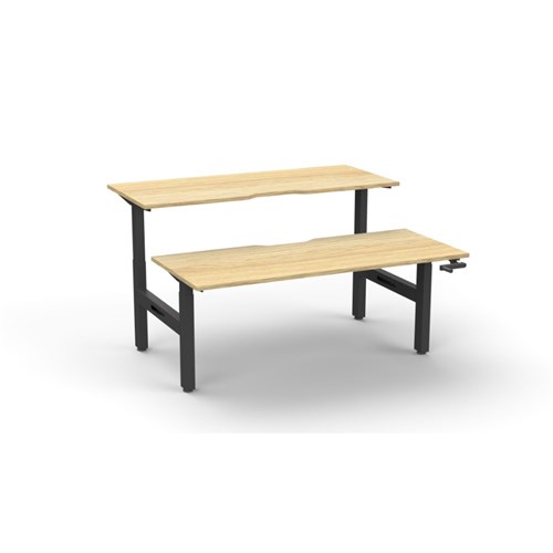 • Rapidline Boost back to back 2 person manual crank height adjustable workstation. Oak top with black frame.
