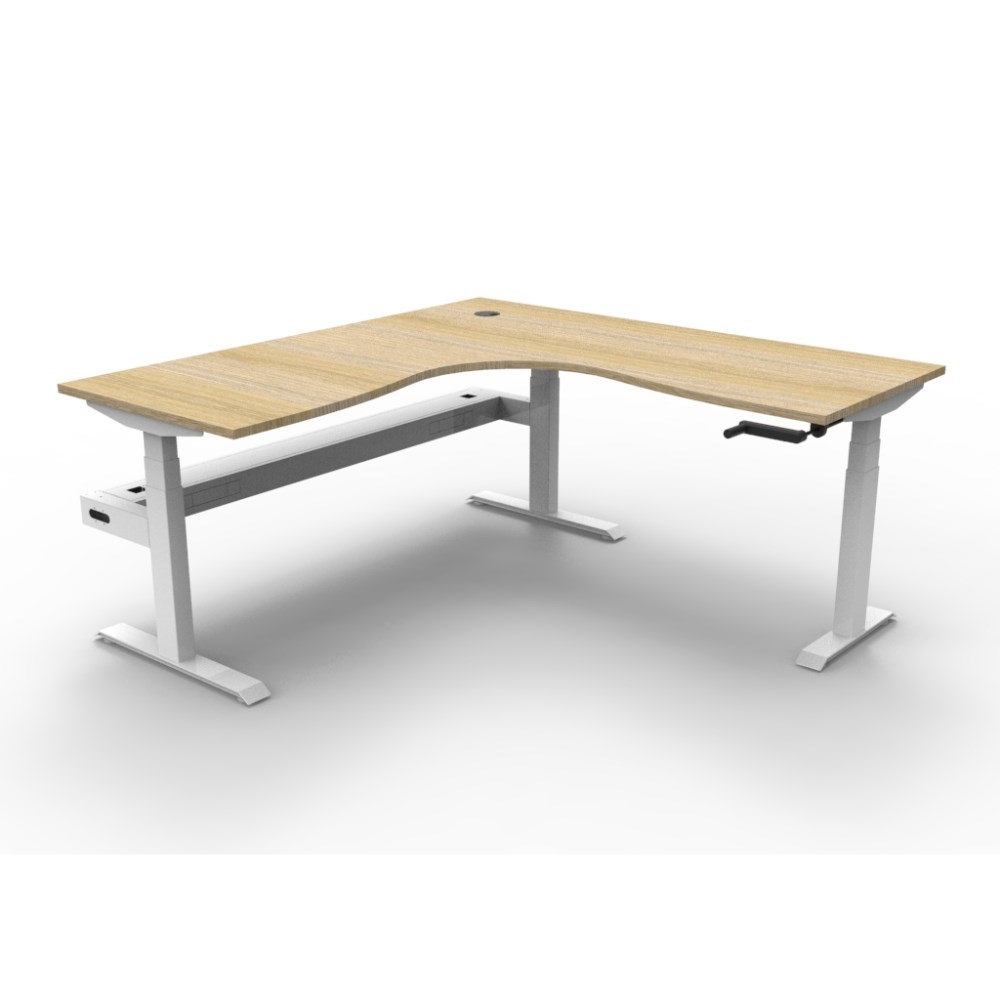 • Rapidline Boost manual crank height adjustable corner workstation with cable tray. Natural oak top with white frame.