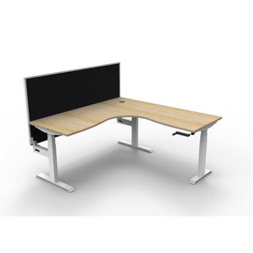 Rapidline Boost manual crank height adjustable corner workstation with screen. Natural oak top with white frame. Dimensions: 1500W x 1500W x 750D x 705mm - 1155mmH. Frame Height: 680mm - 1130mm. Max Speed: 15mm per second (10mm per full turn circle). 1500W x 30T x 900mmH pinnable privacy screen finished in grey fabric with matching white powder coated extrusion. Column Size: 90mm x 60mm. Foot Size: 700mm for main desk and 500mm for return frame. E0 Rated 25mm thick table top with rigid edging and 80mm diameter cable entry with cover. Adjustable leveling feet. Desk mounting top plate size: 500mm. Steel Gauge: 3.0mm, 2.0mm and 1.5mm used throughout. 10 Year Manufacturer's Warranty. Delivery, installation and assembly charges may apply to furniture. Please enquire to confirm.