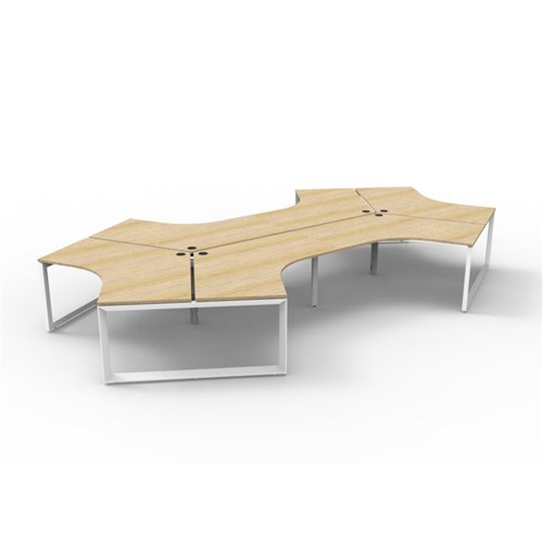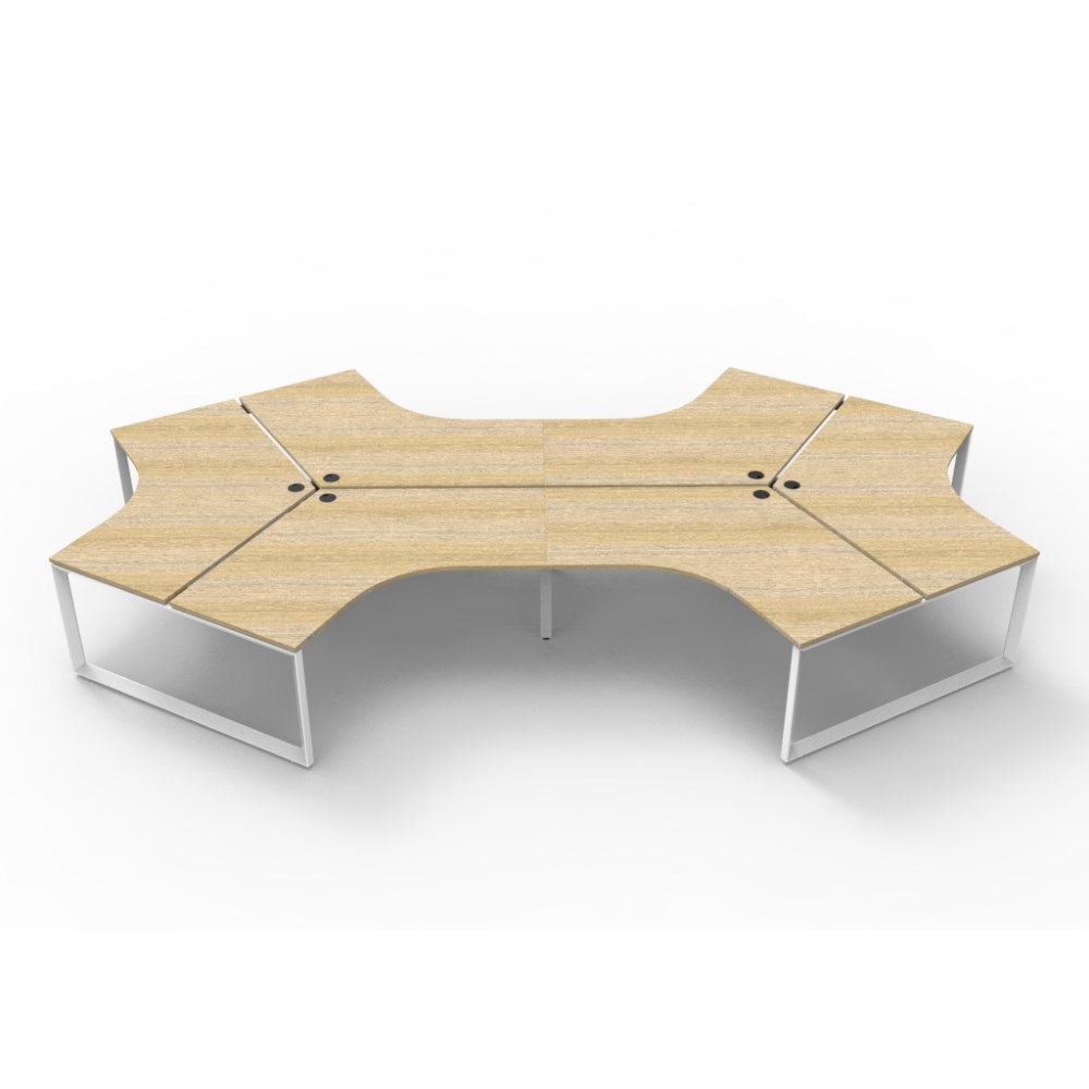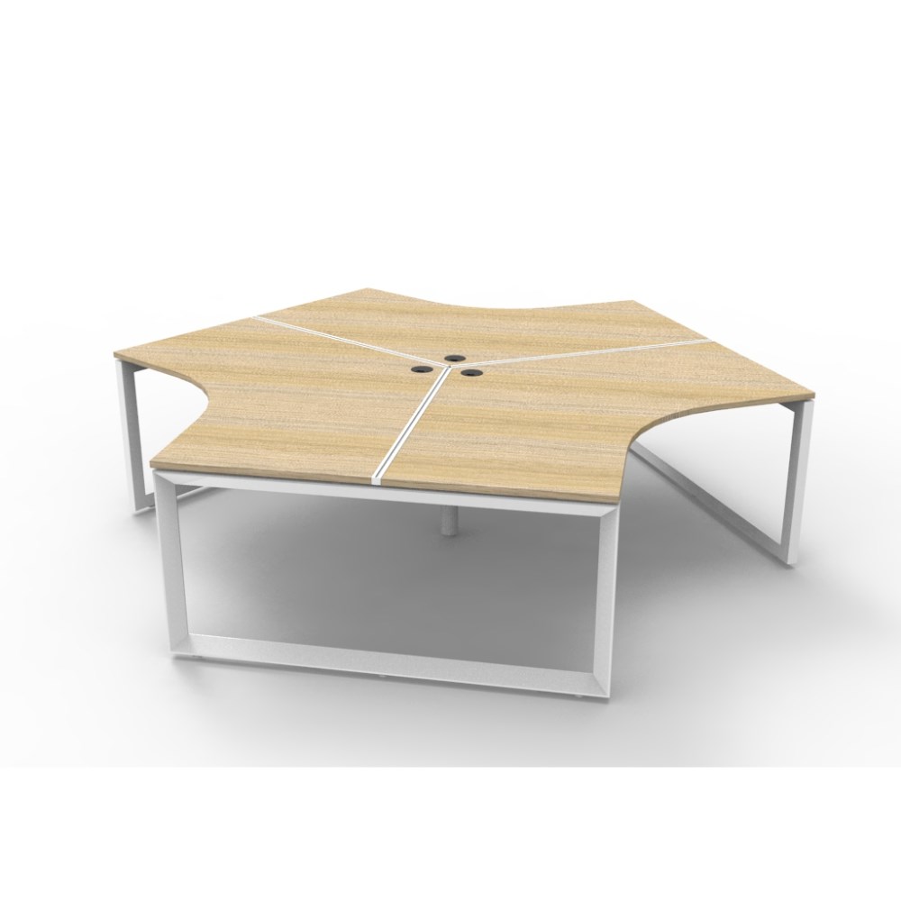 Overall Dimensions: 2866W x 2480D x 730mmH. Per User Dimensions: 1205W x 1205D x 730mmH. Natural oak worksurface with a 60 x 45mm powder coated white Loop leg underframe. 1 x 80mm diameter cable entry hole. 30mm cable access void in between double sided users. Infill rail available at additional cost. Dual cross bar for added stability. E0 enviroboard melamine worksurface. Adjustable leveling feet. 5 Year Manufacturer's Warranty. Delivery, installation and assembly charges may apply to furniture. Please enquire to confirm.