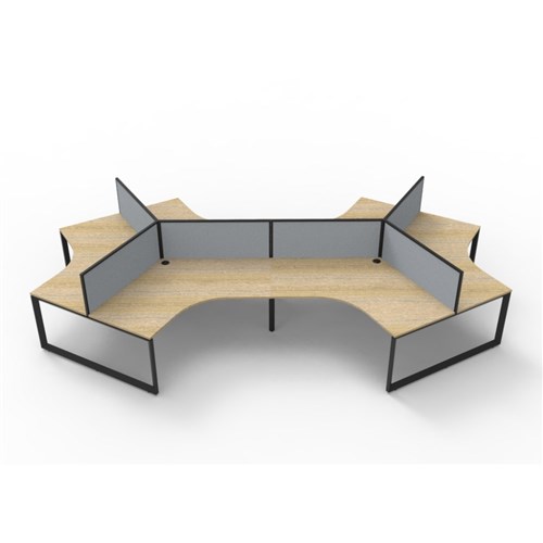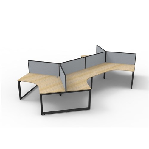 Overall Dimensions: 2866W x 2480D x 1200mm H. Per User Dimensions: 1205W x 1205D x 730mmH. Natural oak worksurface with a 60 x 45mm powder coated black Loop leg underframe and screen. 495mm high x 30mm thick pinnable privacy screen upholstered in grey fabric with matching powder coated extrusion. 1 x 80mm diameter cable entry hole. 30mm cable access void in between double sided users. Infill rail available at additional cost. Dual cross bar for added stability. E0 enviroboard melamine worksurface. Adjustable leveling feet. 5 Year Manufacturer's Warranty. Delivery, installation and assembly charges may apply to furniture. Please enquire to confirm.