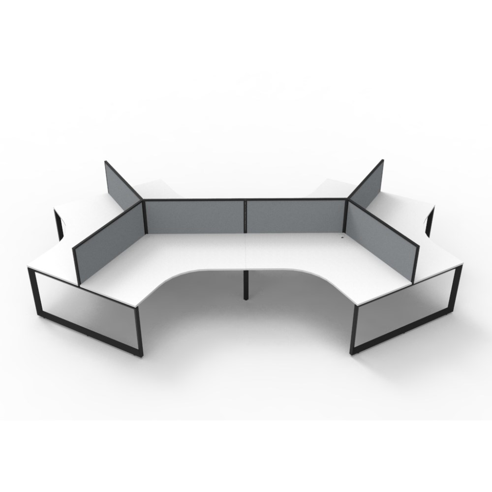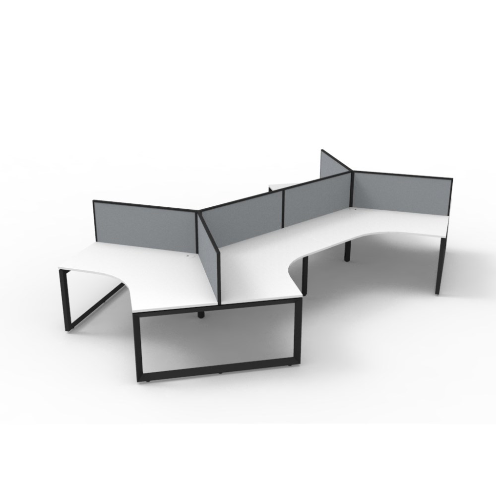 Overall Dimensions: 2866W x 2480D x 1200mm H. Per User Dimensions: 1205W x 1205D x 730mmH. White worksurface with a 60 x 45mm powder coated black Loop leg underframe and screen. 495mm high x 30mm thick pinnable privacy screen upholstered in grey fabric with matching powder coated extrusion. 1 x 80mm diameter cable entry hole. 30mm cable access void in between double sided users. Infill rail available at additional cost. Dual cross bar for added stability. E0 enviroboard melamine worksurface. Adjustable leveling feet. 5 Year Manufacturer's Warranty. Delivery, installation and assembly charges may apply to furniture. Please enquire to confirm.