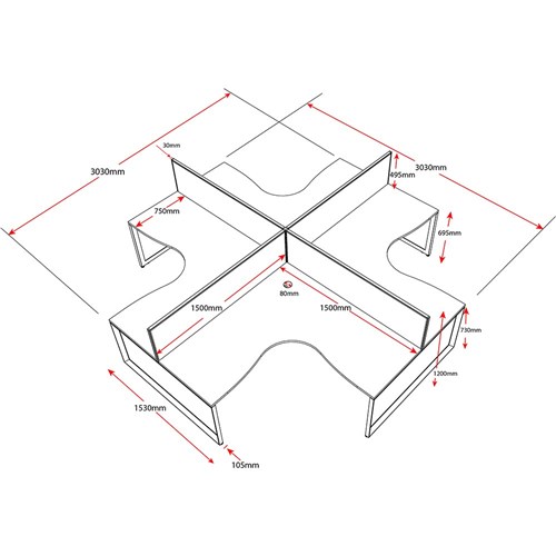 • Overall Including Screen: 3030mm W x 3030mmW x 780mm D x 1200mm H. Per User: 1500mm W x 1500mmW x 750mm D. Desk Height: 730mm.