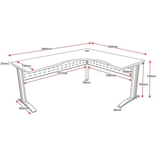 Natural Oak and White in colour. Sturdy powder coated frame and legs. Comes with metal perforated modesty panel. E0 melamine top. 1 x cable entry hole in corner of top. 750mm deep top for more workspace. Adjustable feet. 5 Years Manufacturer's Warranty. Delivery, installation and assembly charges may apply to furniture. Please enquire to confirm.