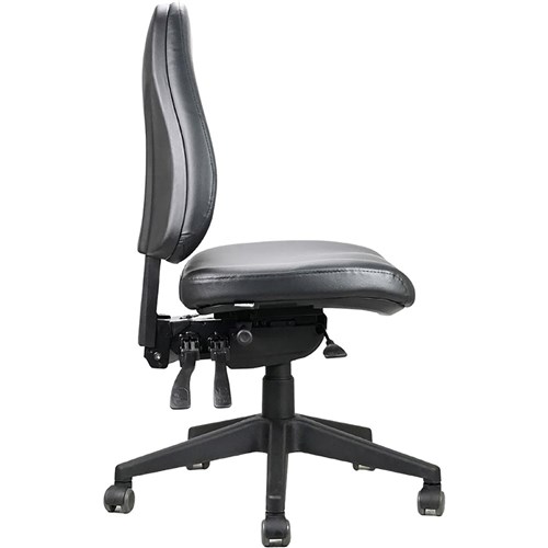 Fully ergonomic 4 lever heavy duty mechanism with seat slide. Back rest & luxurious heavy duty moulded foam seat pan upholstered in antimicrobial silver ion technology black PU. Heavy duty five star spider base with 50mm hard floor castors. AFRDI load rated to 160kg. Overall size of 510mm W x 480mm D x 1040 - 1105mm H. Seat size of 510mm W x 480mm D, seat height of 490 - 565mm H. 10 Year Manufacturer's Warranty. Delivery, installation and assembly charges may apply to furniture. Please enquire to confirm. Optional adjustable armrest available. Refer to product code 2834421.