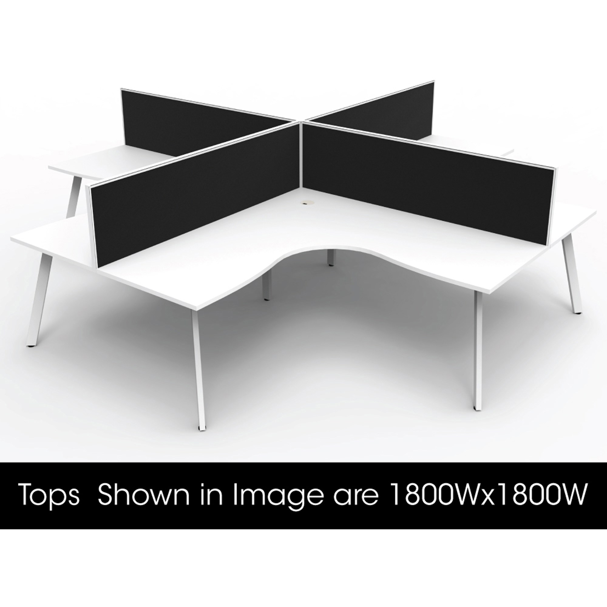 Natural white work surface with white legs and 80mm diameter cable entry hole. Includes pinnable privacy screen in black fabric with matching white powder coated frame. Overall Including Screens: 3630mm W x 3030mm D x 1200mm H. Per User: 1800/1500mm W x 750mm D. Desk Height: 730mm. 60mm x 30mm splayed leg with power coated underframe. Adjustable levelling feet. E0 Enviroboard. Adjustable levelling feet. 5 Year Manufacturer's Warranty. Delivery, installation and assembly charges may apply to furniture. Please enquire to confirm.