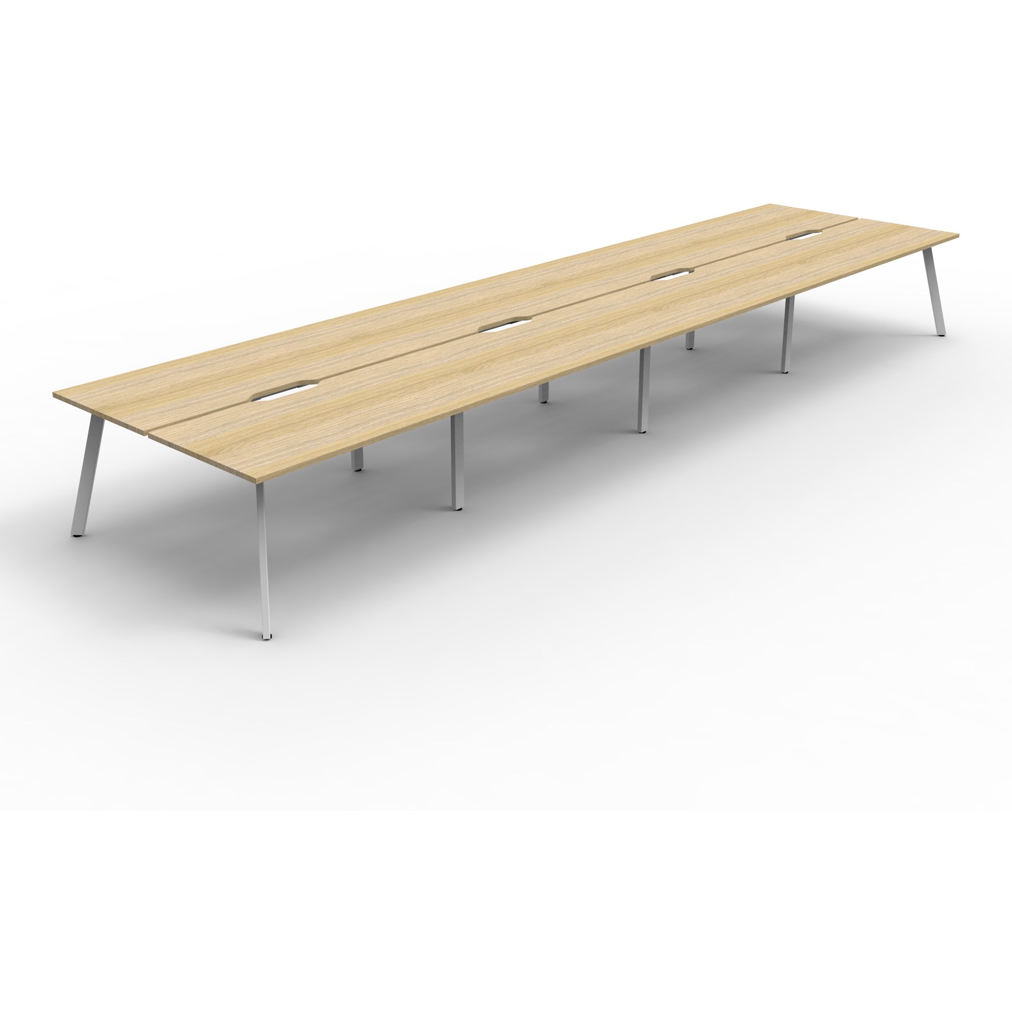 Natural Oak worksurface with 410mm W x 50mm D with white frame. Scallop cable access. No screen. Overall: 7200mm W x 1530mm D x 730mm H. Per User: 1800mm W x 750mm D x 730mm H. 60mm x 30mm splayed leg with power coated underframe. Adjustable levelling feet. 30mm cable access void in between double sided users. Infill rail available at an additional cost. Dual cross bar for added stability. E0 Enviroboard. 5 Year Manufacturer's Warranty. Delivery, installation and assembly charges may apply to furniture. Please enquire to confirm.