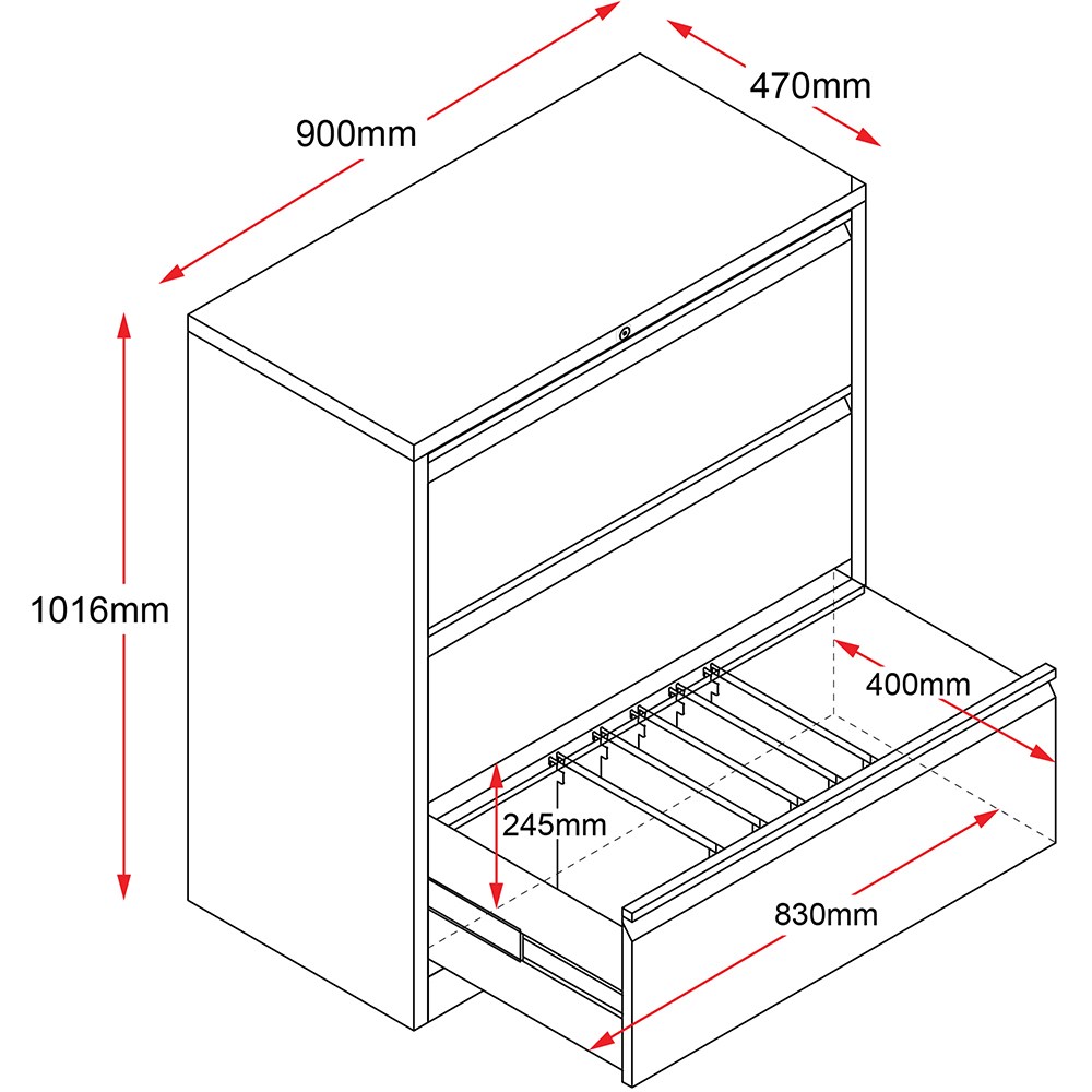 Go Lateral filing cabinets allow 2 rows of Foolscap files per drawer and fit seamlessly into a workstation layout. Riveted construction for extra strength. Anti tilt locking. Master key locking. Keyed alike locks optional extra. Heavy duty ball bearing runners. Weight limit of 60kgs per drawer. No assembly required. 10 Year Manufacturer's Warranty.