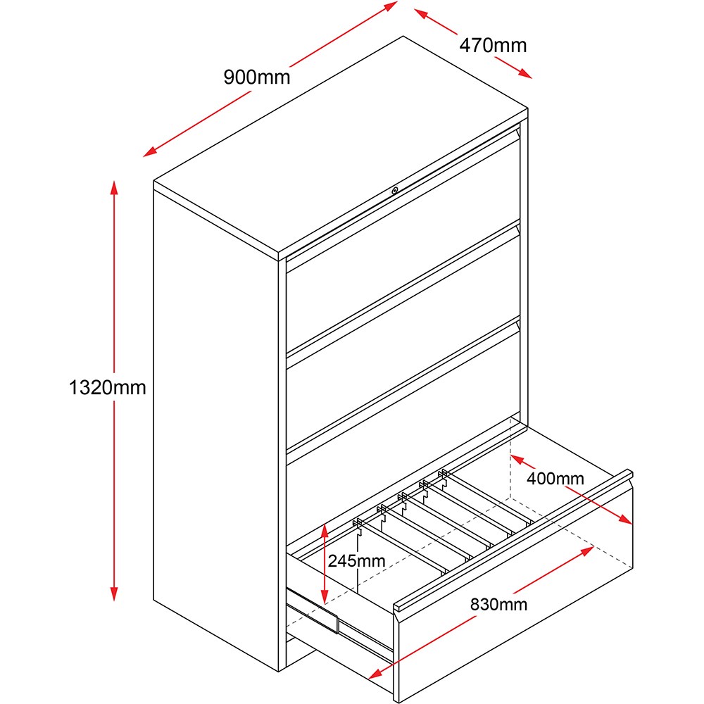 Go Lateral filing cabinets allow 2 rows of Foolscap files per drawer and fit seamlessly into a workstation layout. Riveted construction for extra strength. Anti tilt locking. Master key locking. Keyed alike locks optional extra. Heavy duty ball bearing runners. Weight limit of 60kgs per drawer. No assembly required. 10 Year Manufacturer's Warranty.