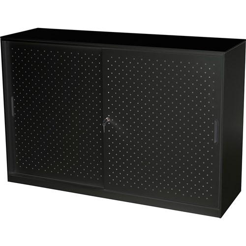 CATEGORY 1 WARNING: This product has a high risk of toppling over. Children have died from furniture tipover. ALWAYS secure this furniture with an anchor device. GO perforated sliding door cupboard with 2 doors. Includes 2 x adjustable shelves - 1 on each side. Perforated door feature with internal acoustic panel for sound absorption. Adjustable leveling feet. Soft closing track system. Lockable doors - comes with 2 keys. 10 Year Manufacturer's Warranty.