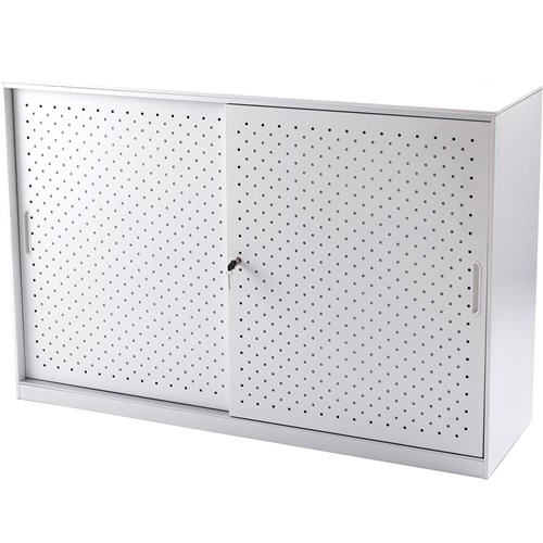 CATEGORY 1 WARNING: This product has a high risk of toppling over. Children have died from furniture tipover. ALWAYS secure this furniture with an anchor device. GO perforated sliding door cupboard with 2 doors. Includes 2 x adjustable shelves - 1 on each side. Perforated door feature with internal acoustic panel for sound absorption. Adjustable leveling feet. Soft closing track system. Lockable doors - comes with 2 keys. 10 Year Manufacturer's Warranty.