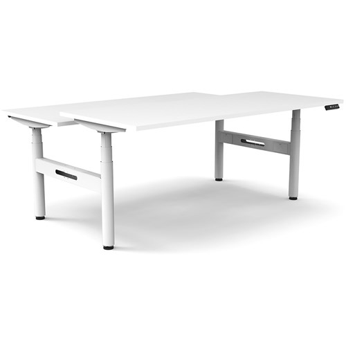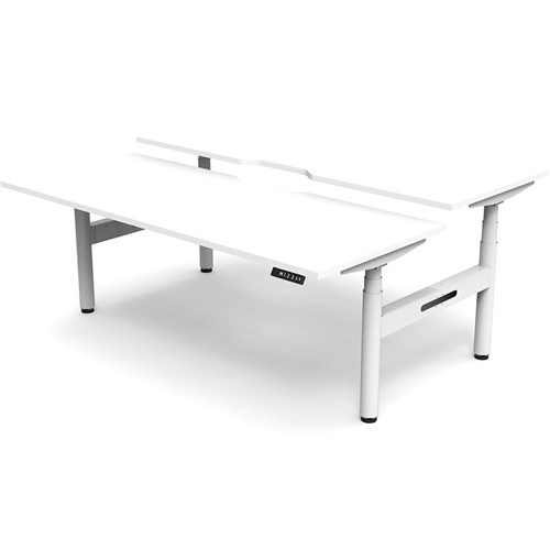White top with White frame. Unit Dimension: 1200mm W x 1500mm D x 620-1270mm H. 750mm depth per user. E0 rated top. Powdercoat base. Digital control panel with 3 pre-set positions, LED display panel, keypad safety lock & reminder alarm setting. Anti-collision technology, noise emission of less than 50DB. Lifting capacity of 120kg with a max speed of 38mm per second. 70mm diameter round column legs. 700mm wide foot size with adjustable leveling feet, return foot: 700mm. 10 Year Manufacturer's Warranty. Delivery, installation and assembly charges may apply to furniture. Please enquire to confirm.