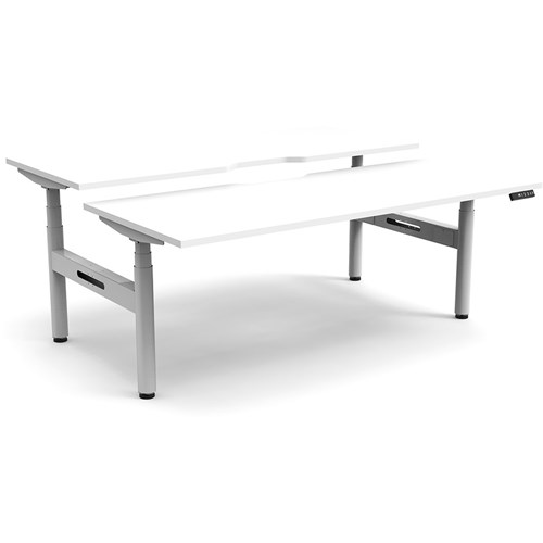 White top with White frame. Unit Dimension: 1500mm W x 1500mm D x 620-1270mm H. 750mm depth per user. E0 rated top. Powdercoat base. Digital control panel with 3 pre-set positions, LED display panel, keypad safety lock & reminder alarm setting. Anti-collision technology, noise emission of less than 50DB. Lifting capacity of 120kg with a max speed of 38mm per second. 70mm diameter round column legs. 700mm wide foot size with adjustable leveling feet, return foot: 700mm. 10 Year Manufacturer's Warranty. Delivery, installation and assembly charges may apply to furniture. Please enquire to confirm.