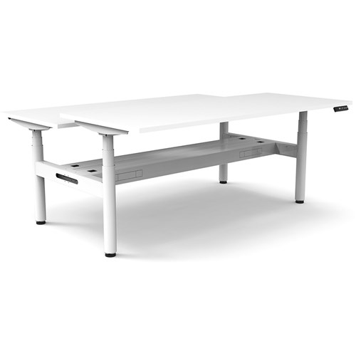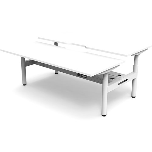 White top with White frame. Unit Dimension: 1200mm W x 1500mm D x 620-1270mm H. 750mm depth per user. E0 rated top. Powdercoat base. Digital control panel with 3 pre-set positions, LED display panel, keypad safety lock & reminder alarm setting. Anti-collision technology, noise emission of less than 50DB. Lifting capacity of 120kg with a max speed of 38mm per second. 70mm diameter round column legs. 700mm wide foot size with adjustable leveling feet, return foot: 700mm. Comes with cable tray for cable management. 10 Year Manufacturer's Warranty. Delivery, installation and assembly charges may apply to furniture. Please enquire to confirm.