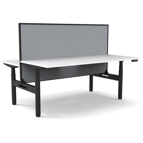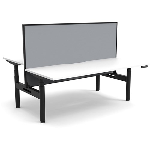 White top with Black frame. Unit Dimension: 1500mm W x 1500mm D x 1330mm H. 620-1270mm height range for desk, 750mm depth per user. E0 rated top. Powdercoat base. Digital control panel with 3 pre-set positions, LED display panel, keypad safety lock & reminder alarm setting. Anti-collision technology, noise emission of less than 50DB. Lifting capacity of 120kg with a max speed of 38mm per second. 70mm diameter round column legs. 700mm wide foot size with adjustable leveling feet, return foot: 700mm. Comes with 30mm thick privacy screen. 10 Year Manufacturer's Warranty. Delivery, installation and assembly charges may apply to furniture. Please enquire to confirm.