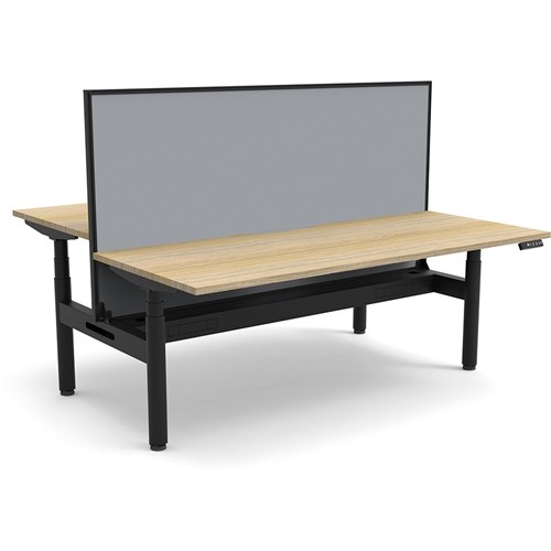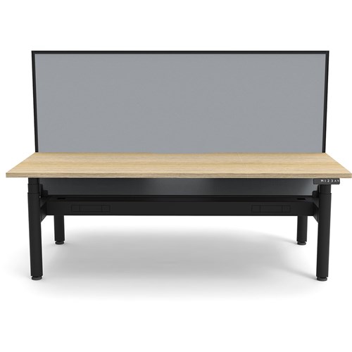Natural Oak top with Black frame. Unit Dimension: 1200mm W x 1500mm D x 1330mm H. 620-1270mm height range for desk, 750mm depth per user. E0 rated top. Powdercoat base. Digital control panel with 3 pre-set positions, LED display panel, keypad safety lock & reminder alarm setting. Anti-collision technology, noise emission of less than 50DB. Lifting capacity of 120kg with a max speed of 38mm per second. 70mm diameter round column legs. 700mm wide foot size with adjustable leveling feet, return foot: 700mm. Comes with 30mm thick privacy screens and cable tray for cable management. 10 Year Manufacturer's Warranty. Delivery, installation and assembly charges may apply to furniture. Please enquire to confirm.