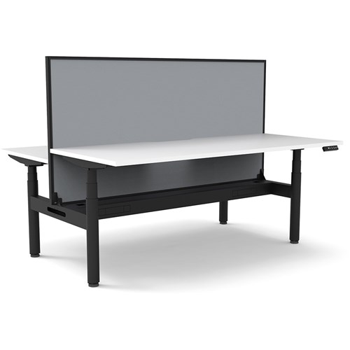 White top with Black frame. Unit Dimension: 1200mm W x 1500mm D x 1330mm H. 620-1270mm height range for desk, 750mm depth per user. E0 rated top. Powdercoat base. Digital control panel with 3 pre-set positions, LED display panel, keypad safety lock & reminder alarm setting. Anti-collision technology, noise emission of less than 50DB. Lifting capacity of 120kg with a max speed of 38mm per second. 70mm diameter round column legs. 700mm wide foot size with adjustable leveling feet, return foot: 700mm. Comes with 30mm thick privacy screens and cable tray for cable management. 10 Year Manufacturer's Warranty. Delivery, installation and assembly charges may apply to furniture. Please enquire to confirm.