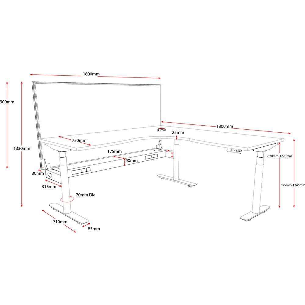 White top with White frame. Unit Dimension: 1800/1800mm W x 750mm D x 1330mm H. 620-1270mm height range for desk. E0 rated top. Powdercoat base. Digital control panel with 3 pre-set positions, LED display panel, keypad safety lock & reminder alarm setting. Anti-collision technology, noise emission of less than 50DB. Lifting capacity of 120kg with a max speed of 38mm per second. 70mm diameter round column legs. 700mm wide foot size with adjustable leveling feet, return foot: 700mm. Comes with 30mm thick privacy screens and cable tray for cable management. 10 Year Manufacturer's Warranty. Delivery, installation and assembly charges may apply to furniture. Please enquire to confirm.