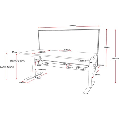 White top with White frame. Unit Dimension: 1200mm W x 750mm D x 620-1270mm H. E0 rated top. Powdercoat base. Digital control panel with 3 pre-set positions, LED display panel, keypad safety lock & reminder alarm setting. Anti-collision technology, noise emission of less than 50DB. Lifting capacity of 120kg with a max speed of 38mm per second. 70mm diameter round column legs. 700mm wide foot size with adjustable leveling feet, return foot: 700mm. 10 Year Manufacturer's Warranty. Delivery, installation and assembly charges may apply to furniture. Please enquire to confirm.