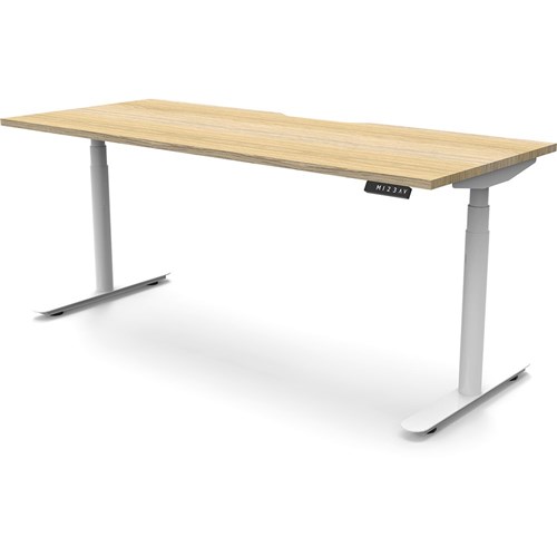 Natural Oak top with White frame. Unit Dimension: 1800mm W x 750mm D x 620-1270mm H. E0 rated top. Powdercoat base. Digital control panel with 3 pre-set positions, LED display panel, keypad safety lock & reminder alarm setting. Anti-collision technology, noise emission of less than 50DB. Lifting capacity of 120kg with a max speed of 38mm per second. 70mm diameter round column legs. 700mm wide foot size with adjustable leveling feet, return foot: 700mm. 10 Year Manufacturer's Warranty. Delivery, installation and assembly charges may apply to furniture. Please enquire to confirm.