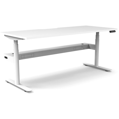 White top with White frame. Unit Dimension: 1500mm W x 750mm D x 620-1270mm H. Comes with cable tray for cable management. E0 rated top. Powdercoat base. Digital control panel with 3 pre-set positions, LED display panel, keypad safety lock & reminder alarm setting. Anti-collision technology, noise emission of less than 50DB. Lifting capacity of 120kg with a max speed of 38mm per second. 70mm diameter round column legs. 700mm wide foot size with adjustable leveling feet, return foot: 700mm. Comes with cable tray for cable management. 10 Year Manufacturer's Warranty. Delivery, installation and assembly charges may apply to furniture. Please enquire to confirm.
