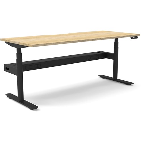 Natural Oak top with Black frame. Unit Dimension: 1800mm W x 750mm D x 620-1270mm H. Comes with cable tray for cable management. E0 rated top. Powdercoat base. Digital control panel with 3 pre-set positions, LED display panel, keypad safety lock & reminder alarm setting. Anti-collision technology, noise emission of less than 50DB. Lifting capacity of 120kg with a max speed of 38mm per second. 70mm diameter round column legs. 700mm wide foot size with adjustable leveling feet, return foot: 700mm. Comes with cable tray for cable management. 10 Year Manufacturer's Warranty. Delivery, installation and assembly charges may apply to furniture. Please enquire to confirm.