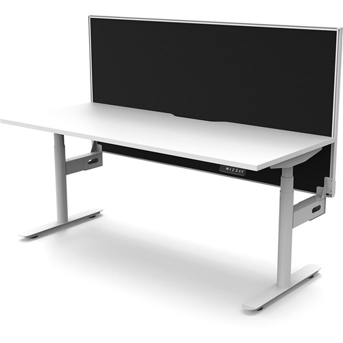 White top with White frame. Unit Dimension: 1200mm W x 750mm D x 1330mm H. 620-1270mm height range for desk. E0 rated top. Powdercoat base. Digital control panel with 3 pre-set positions, LED display panel, keypad safety lock & reminder alarm setting. Anti-collision technology, noise emission of less than 50DB. Lifting capacity of 120kg with a max speed of 38mm per second. 70mm diameter round column legs. 700mm wide foot size with adjustable leveling feet, return foot: 700mm. Comes with 30mm thick privacy screen. 10 Year Manufacturer's Warranty. Delivery, installation and assembly charges may apply to furniture. Please enquire to confirm.