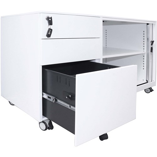 Two personal drawers and one filing drawer, Tambour section with an adjustable shelf. Foolscap size files run front to back in file drawer, A4 size files run side to side in file drawer. Internals: Tambour Size 560W x 740D x 500H, Top two drawers 320W x 460D x 70H, Bottom filing drawer 320W x 460D x 240H. Fully lockable. Flush front mobile pedestal. Ball bearing runners to drawers. Available in right or left sided Tambour door. No assembly required. 10 Year Manufacturer's Warranty.