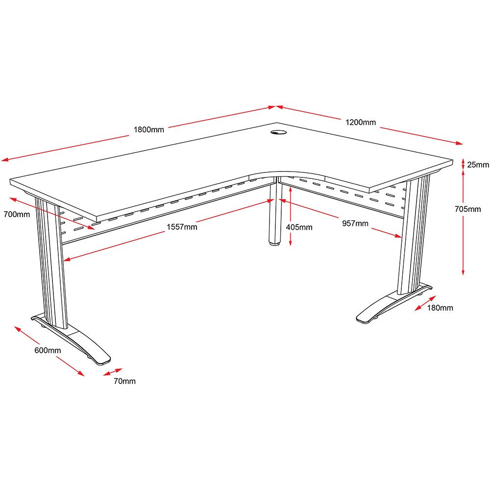 One piece corner workstation with 25mm top. Sturdy powder coated frame and legs. Comes with metal perforated modesty panel and cable tidy. E0 Enviroboard top. 1 x 80mm cable entry hole in corner of top. Adjustable feet. 5 Years Manufacturer's Warranty. Delivery, installation and assembly charges may apply to furniture. Please enquire to confirm.