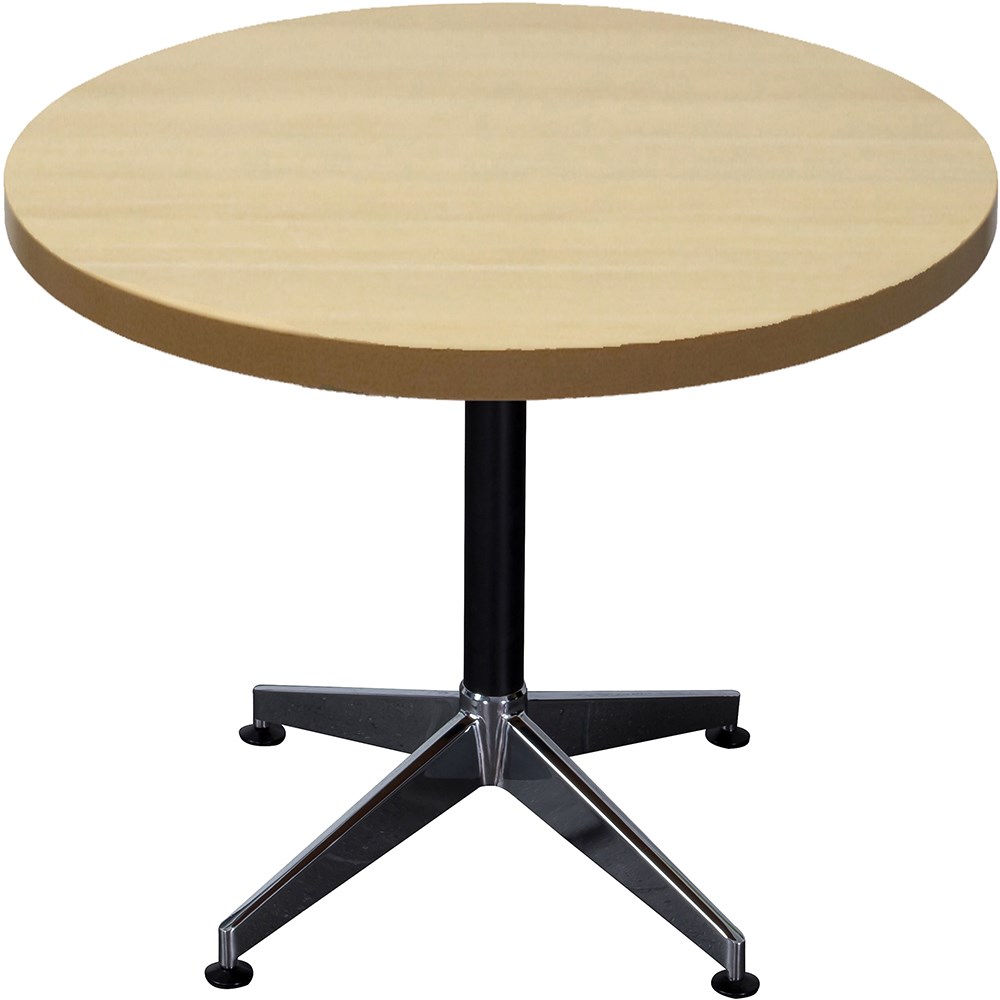 Natural oak top black base in colour. The Typhoon meeting table has a black stem and polished aluminium stable 4 star base. Adjustable feet. With E0 safety standard rated melamine board. 5 Year Manufacturer's Warranty.