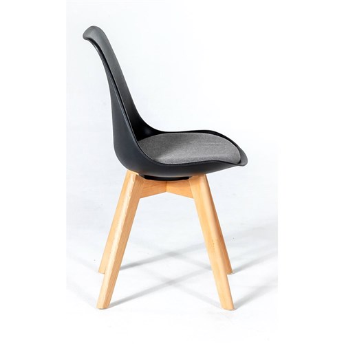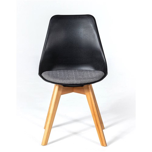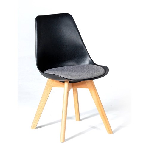 Black shell and grey pad. Polypropylene shell. Solid timber legs. Soft upholstered seat pad Great for Breakout and Collaboration spaces. Chair Dimensions: 440W x 440D x 825mmH. Seat Height 470mm. 3 Year Manufacturer's Warranty.