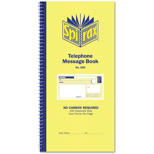 Spirax 550 Telephone Message Book Carbonless 4 Per Page 160 Duplicate Sets Side Opening