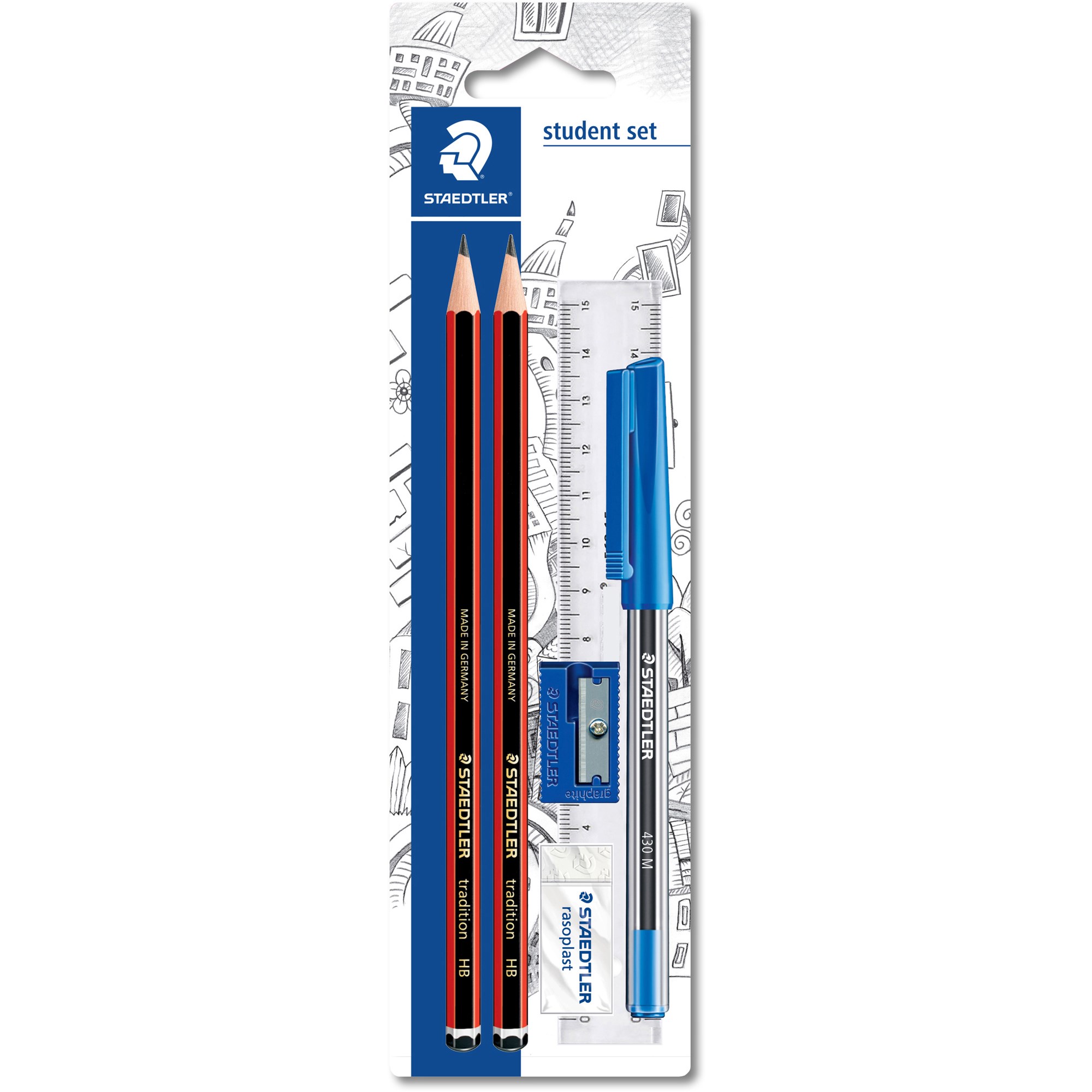 • Tradition® set contains: 2x HB graphite pencils, 1x Rasoplast® small eraser (526 B40), 1x Stick 430 ballpoint pen (430 M-3), 1x 15cm ruler & single hole plastic sharpener.