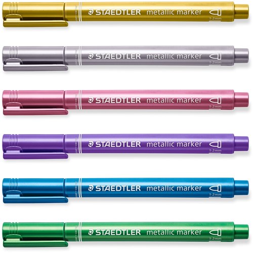 Staedtler® vibrant water based metallic markers. Smooth writing first time, everytime without shaking or pumping. Perfect for certificate writing, scrapbooking and greeting cards.