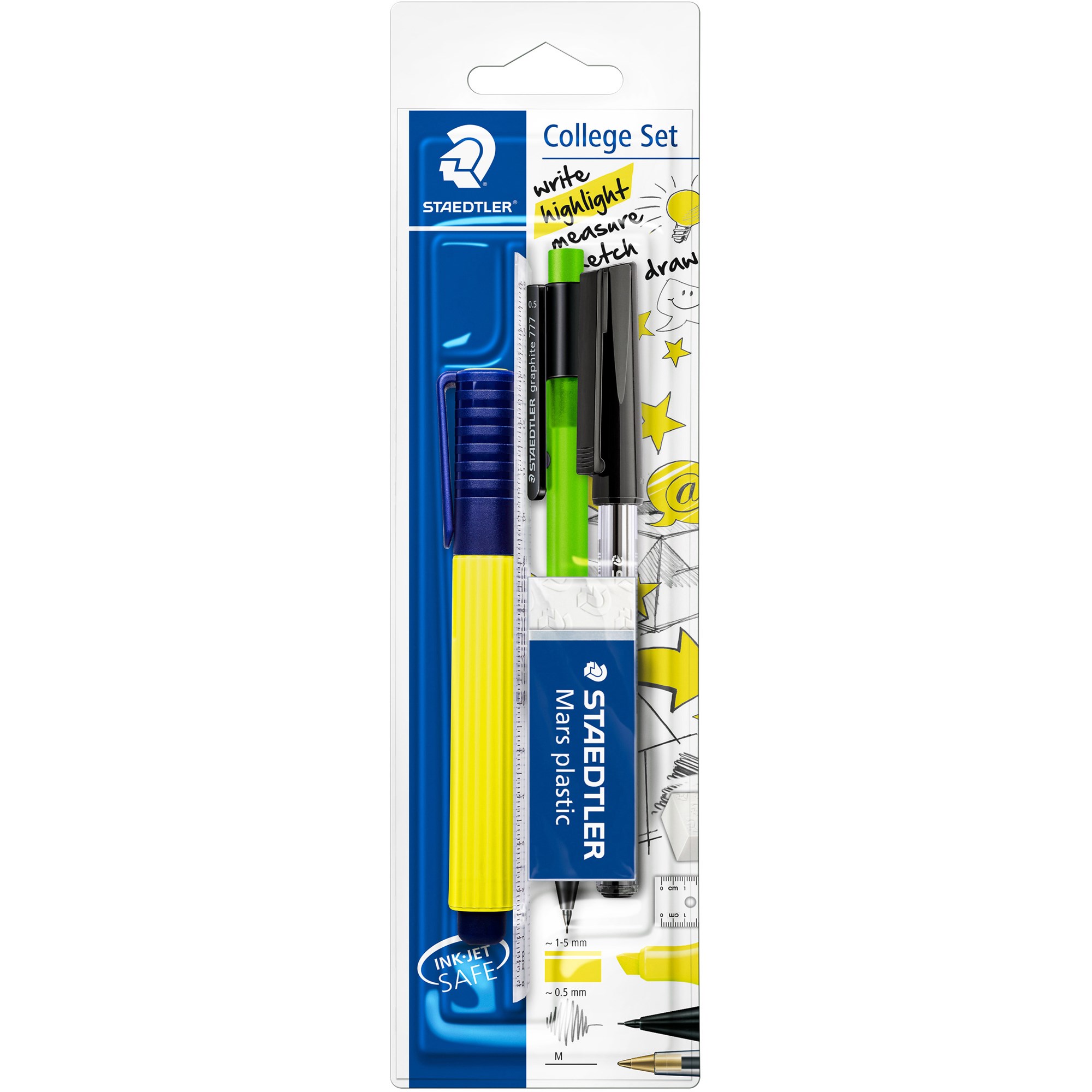 • The College set contains: 1x Textsurfer® classic highlighter, 1x Mars® plastic eraser, 1x Stick 430 ballpen, 1x 15 cm ruler & 1x graphite 777 mechanical pencil.