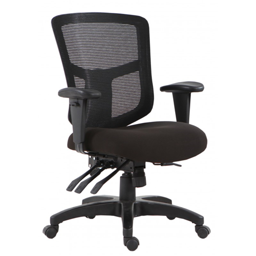 Fully Ergonomic clerical task chair, multi-functional gas lift mechanism designed for strength, fully upholstered seat, black mesh back for breathability and support, pneumatic height adjustable seat, seat depth adjustable, back tilt tension adjustable, armrests height & width adjustable, BIFMA Approved