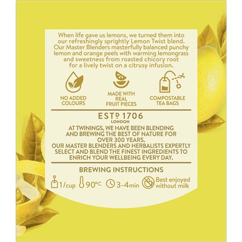 A herbal infusion combines lemon peel and lemongrass to create a refreshing drink. Store the tea in a cool dry place away from odours.