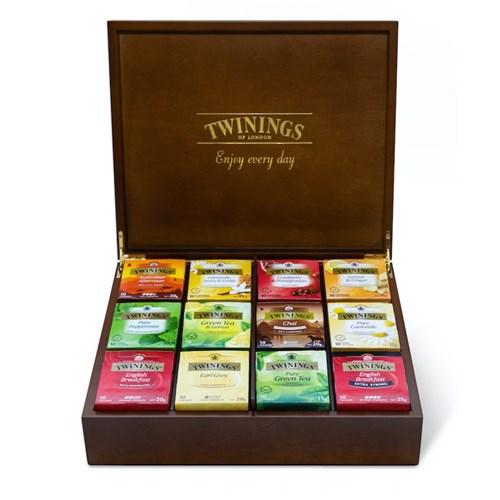 • 12 compartments contains a combination of teas in a uniquely crafted wooden box including: Green Tea and Lemon, Chai and Vanilla, Pure Camomile, English Breakfast, Earl Grey, Pure Green Tea, English Breakfast Extra Strong, Pure Peppermint,