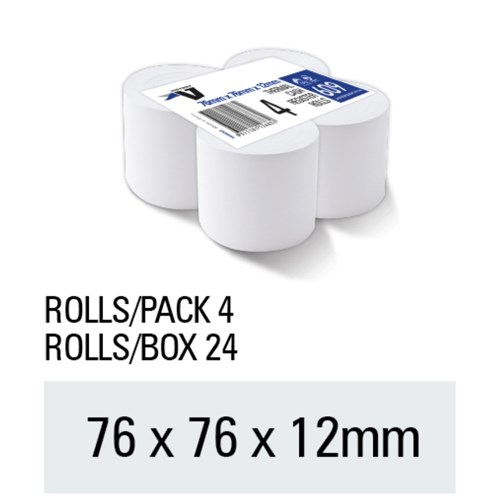 Suitable for use in most cash registers and EFTPOS terminals. Paper weight: 58gsm. Roll size: 76 x 76mm. Core size: 11.5mm. Roll length: 90m. 1 ply. Lint free. Pack of 4.