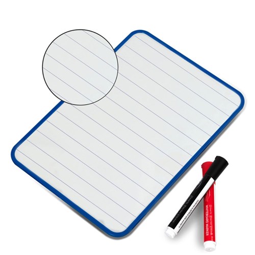 Plain one side and lined the other. Lightweight magnetic whiteboards ideal for agile education. Great for collaborative group and individual focused learning. Add the optional Magnetic eraser/marker to make a complete individual student whiteboard solution, please see product 3039136. Size: 297W x 210mmH. Sturdy navy blue moulded frame. Save paper and allow students to practice skills. Use any whiteboard markers, wipes clean easily.