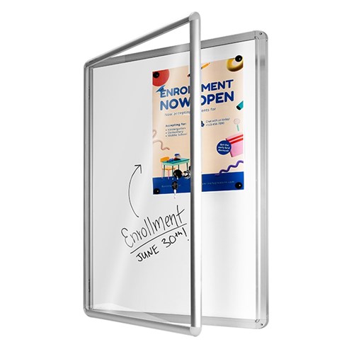 Dry-erase magnetic whiteboard surface with Silver frame. Lockable and with concealed wall fixings. 33mm depth from wall. Includes 6 magnets.